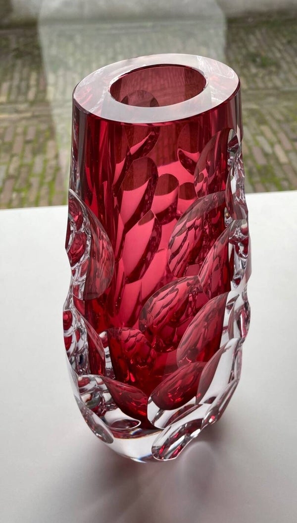 Mondgeblazen, handgevormd en geslepen. Uitgevoerd in helder en cyclaamkleurig glas. Met mooie facetten geslepen wat een fraai effect geeft. Aan de onderzijde gesigneerd PKarizek. Gefotografeerd met kunstlicht en daglicht. Hoog 26 cm. Breed 20 cm. Diep 8 cm.