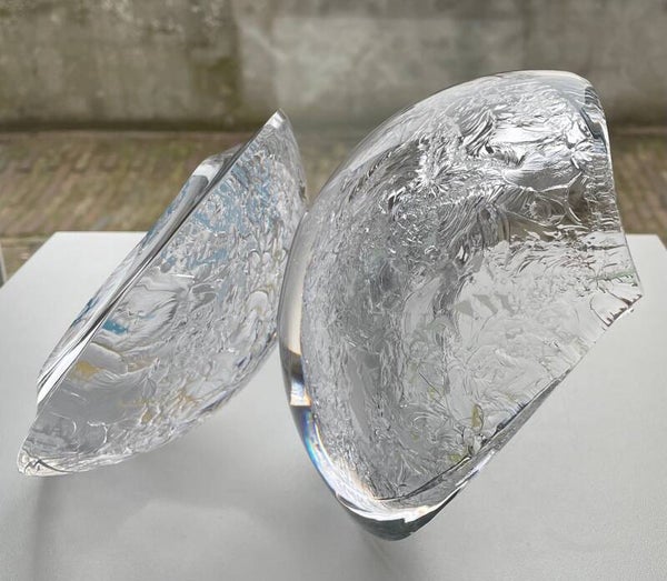 Unique glasobject van de Tsjechische glaskunstenaar Petr Kuchta.Mondgeblazen, geslepen en gepolijst. Uitgevoerd in helder glas met een minimaal spoortje lichtblauw. Aan de binnenzijde heeft het glas en speciale bewerking gehad waardoor een " verijsd " effect ontstaat. Vanuit ieder hoek verrassend anders.gesigneerd met een diamantpen. Hoog 16 cm. Breed 24 cm. Diep 19 cm. Gewicht 4 kilo. Gefotografeerd met daglicht en kunstlicht.